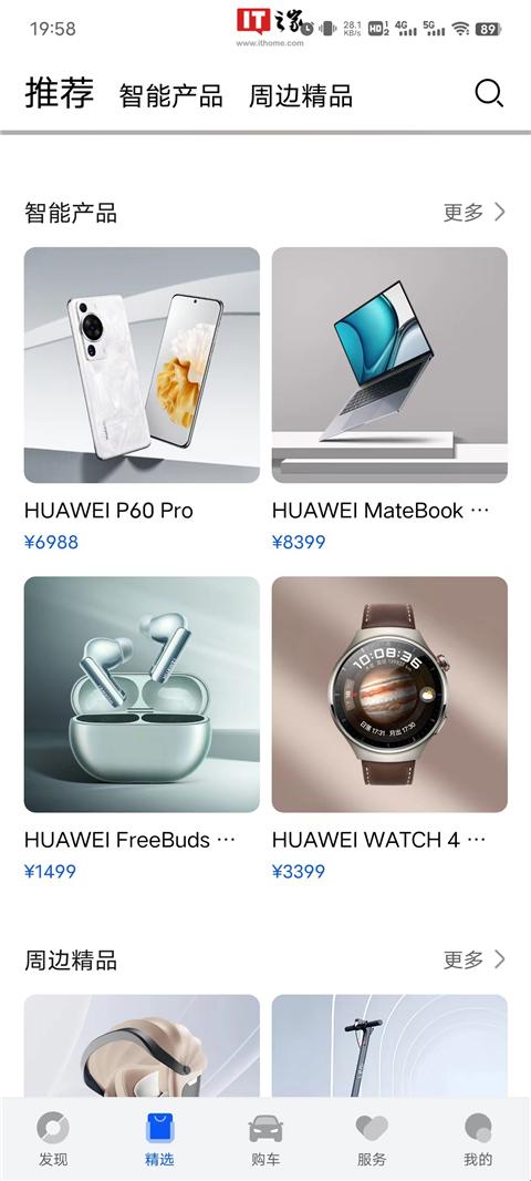 2、精选版块则为“购物频道”,可以购买华为旗下的各种产品,“周边精品”有四款智选产品。