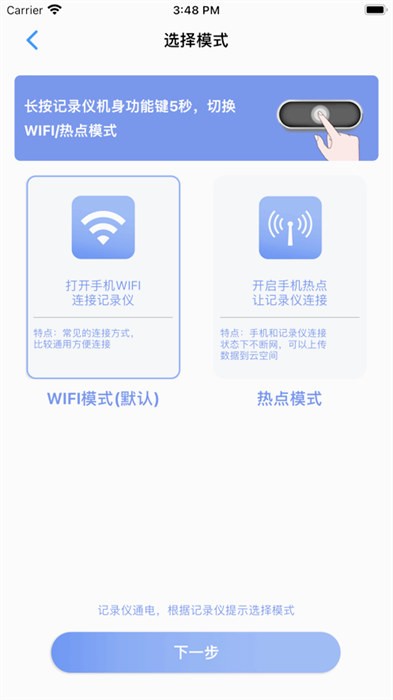 1、选择自己所需要的模式去进行使用,连接上自己的行车记录仪就可以使用;