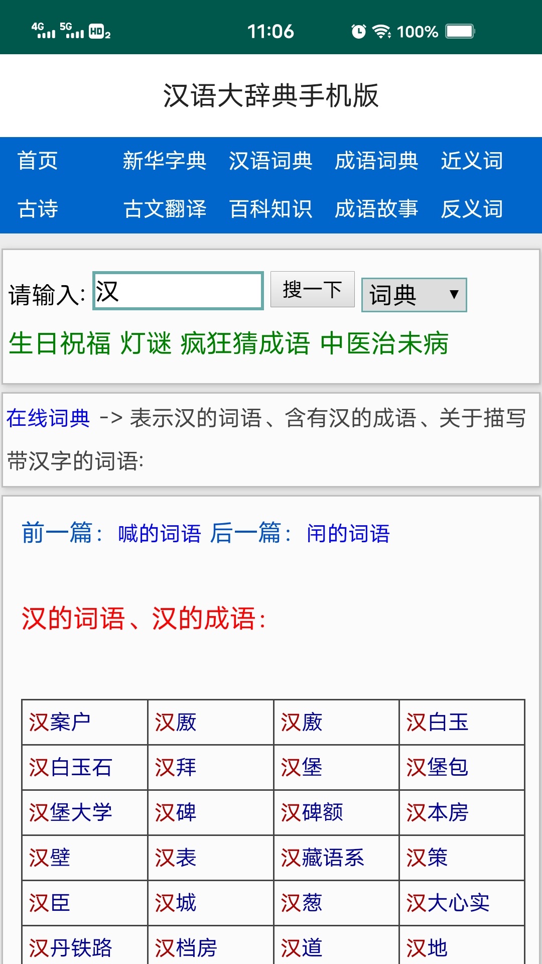 汉语大辞典,一般又称汉辞网汉语大辞典手机版。汉语大辞典是一款专业实用、操作简单的词典工具软件。《汉语大辞典 App》可查成语5万条、汉字20973个、词语384925条、诗词93535首、灯谜41090条、对联5399幅、近义词反义词别名各1000余组、各级教材文言、译文等。在网络时代,适合大数据应用,高效便捷。