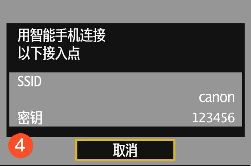 *如果没有出现相机的SSID和密码,重新按一下菜单键,退出,回到:连接至智能手机--确认/更改设置--更改设置--相机接入点模式--轻松连接