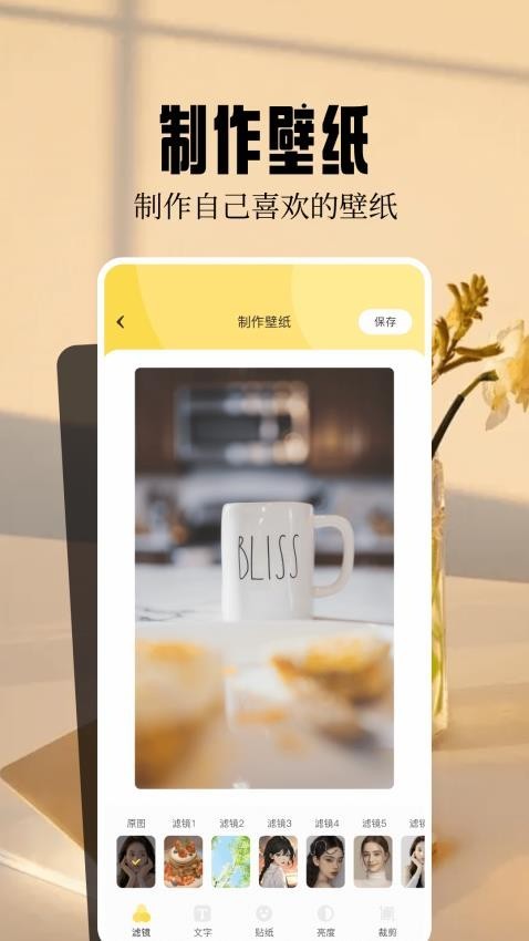 4、进行壁纸制作,可自由选择喜欢的滤镜、贴纸进行壁纸装饰,还能自定义位置;
