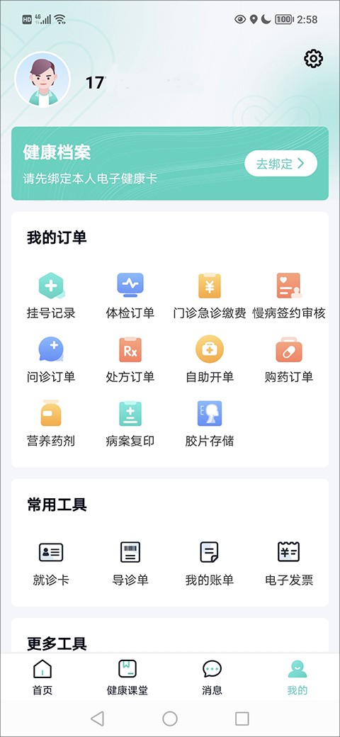 1、下载打开app,在我的页面常用工具中找到并点击“就诊卡”按键;