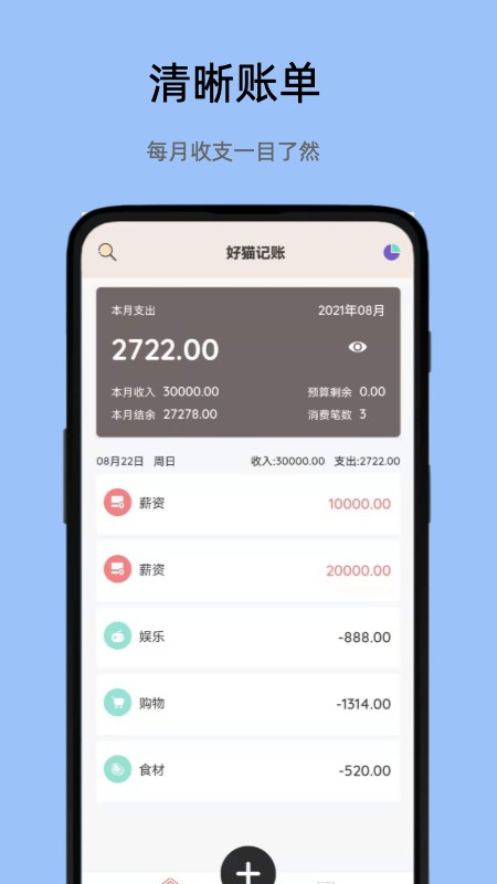 好猫记账是一款简单而实用的账务管理助手,转为渴望掌握个人财务状况的你量身打造,无论是在忙碌的工作间隙,还是休闲的居家时光,只需轻触屏幕,即可开始你的理财旅程。它不仅助你记录每一笔收支,更通过直观图表呈现收支全貌,让你清晰洞察财务走向。告别杂乱无章的账本,拥抱清晰有序的财务管理新纪元。