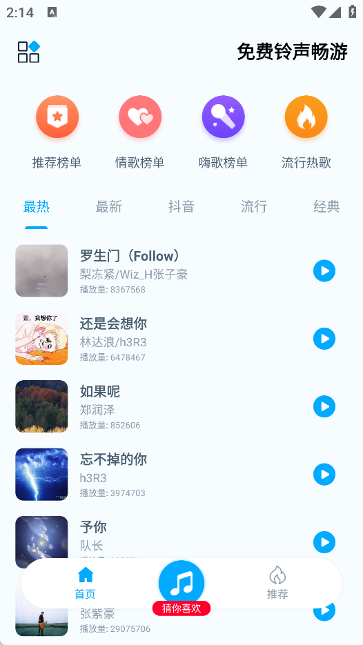 免费铃声畅游是一款可以自由更换不同的手机铃声的软件,里面有海量的手机铃声供你选择,无论是抖音热歌,还是经典老歌,你都可以进行使用,而且铃声都是免费的,不需要额外收费,歌曲资源也会紧跟时事,实时更新,这里的铃声都可以进行试听,不满意的可以更换,需要的用户快快来下载吧。
