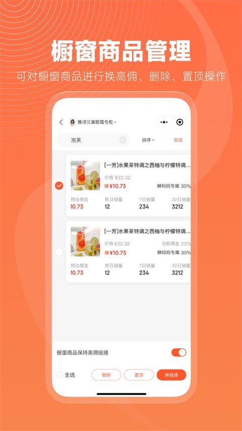5、橱窗商品管理,可对橱窗商品进行换高佣、删除、置顶操作