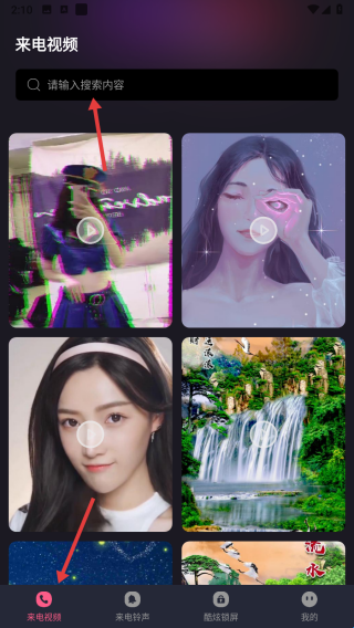 1、在【来电视频】页点搜索框,输关键词找内容。