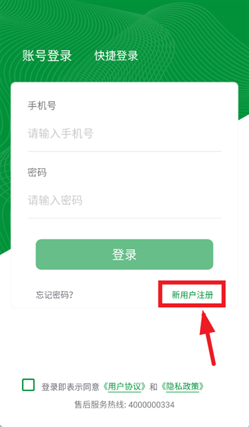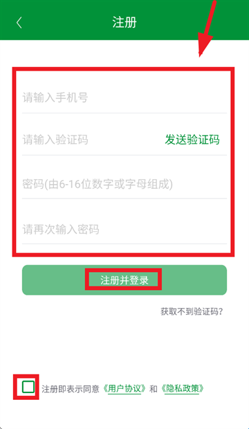3、安装输入手机号,验证码,密码,勾选注册即表示同意 《用户协议》和 《隐私政策》,点击注册并登录即可。
