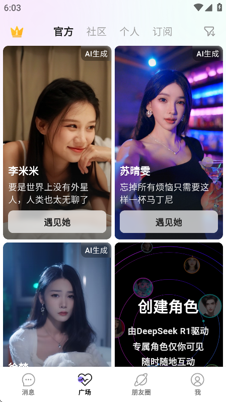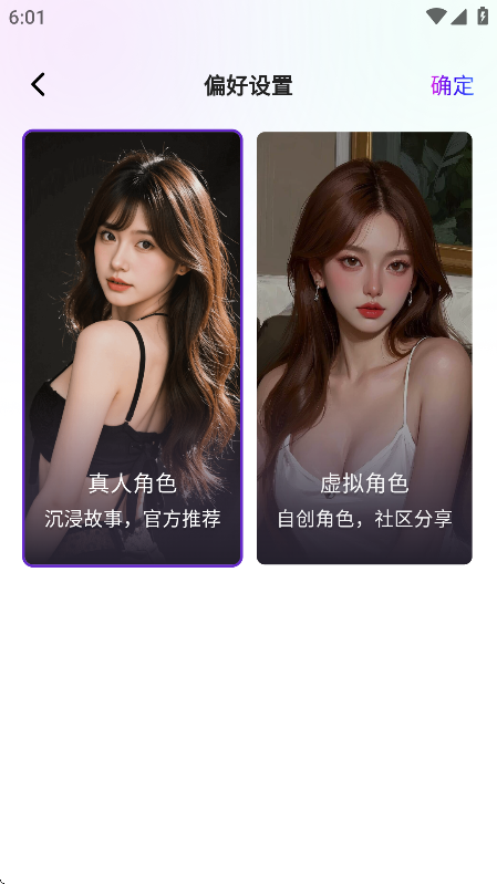 1、内置了多种类型的虚拟人物,涵盖不同性别、年龄、职业、性格等维度,用户可以在线挑选交友。