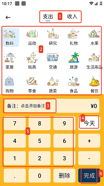 3、选择支出/收入分类选择标签可根据需要选择是否需要添加标签选择日期输入金额最后点击完成。