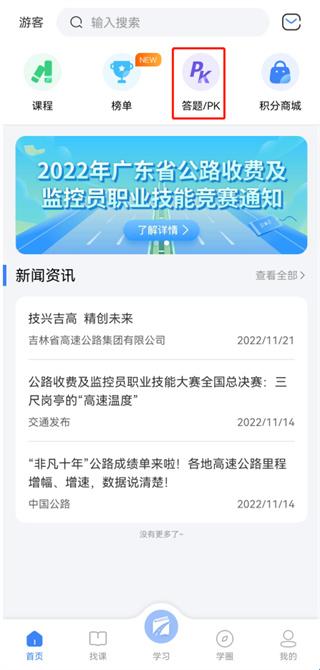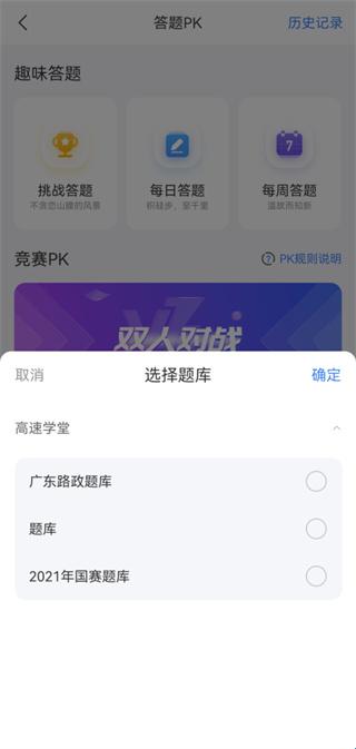 1、双击打开高速学堂软件,点击软件上方的答题/PK。