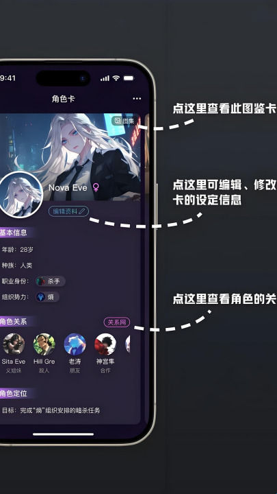 3、还可以编辑图鉴卡的设定信息和关系网。