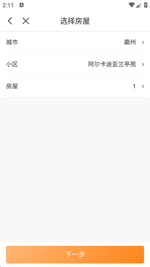 2、首先需要先绑定您的房屋(已绑定可跳过),城市小区房屋,点击下一步。