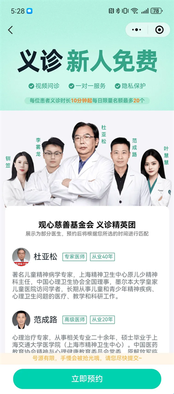 2、活动仅限未在观心平台付费问诊过的新用户,每人限享一次。(新用户第一次注册登录后即可看到义诊页面)