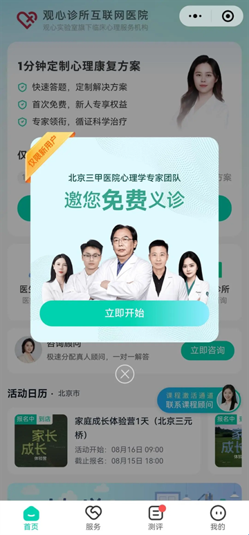1、新用户打开「观心实验室」APP,点击义诊弹窗。