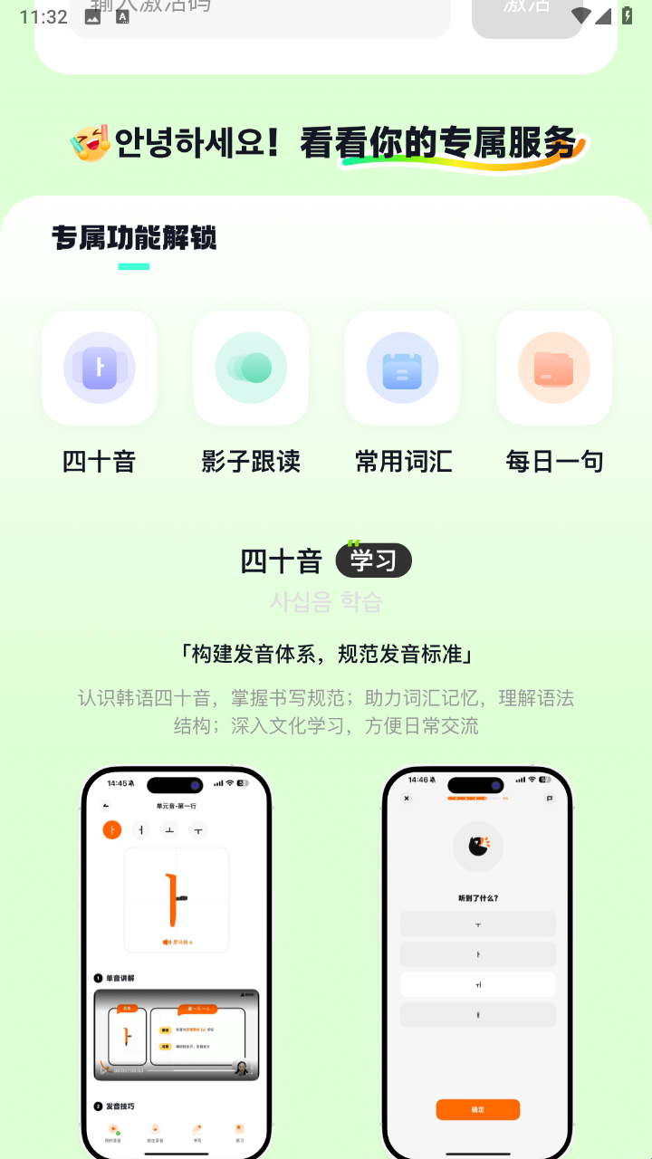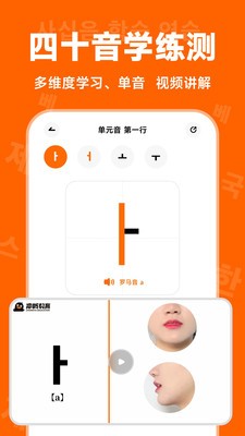 3、40音基础学习,40音单音学习的听说读写练各个维度巩固,你可以通过学练测,复习等一全套流程多方位的掌握40音,最后能自由脱口而出,为韩语入门打好坚实的基础。