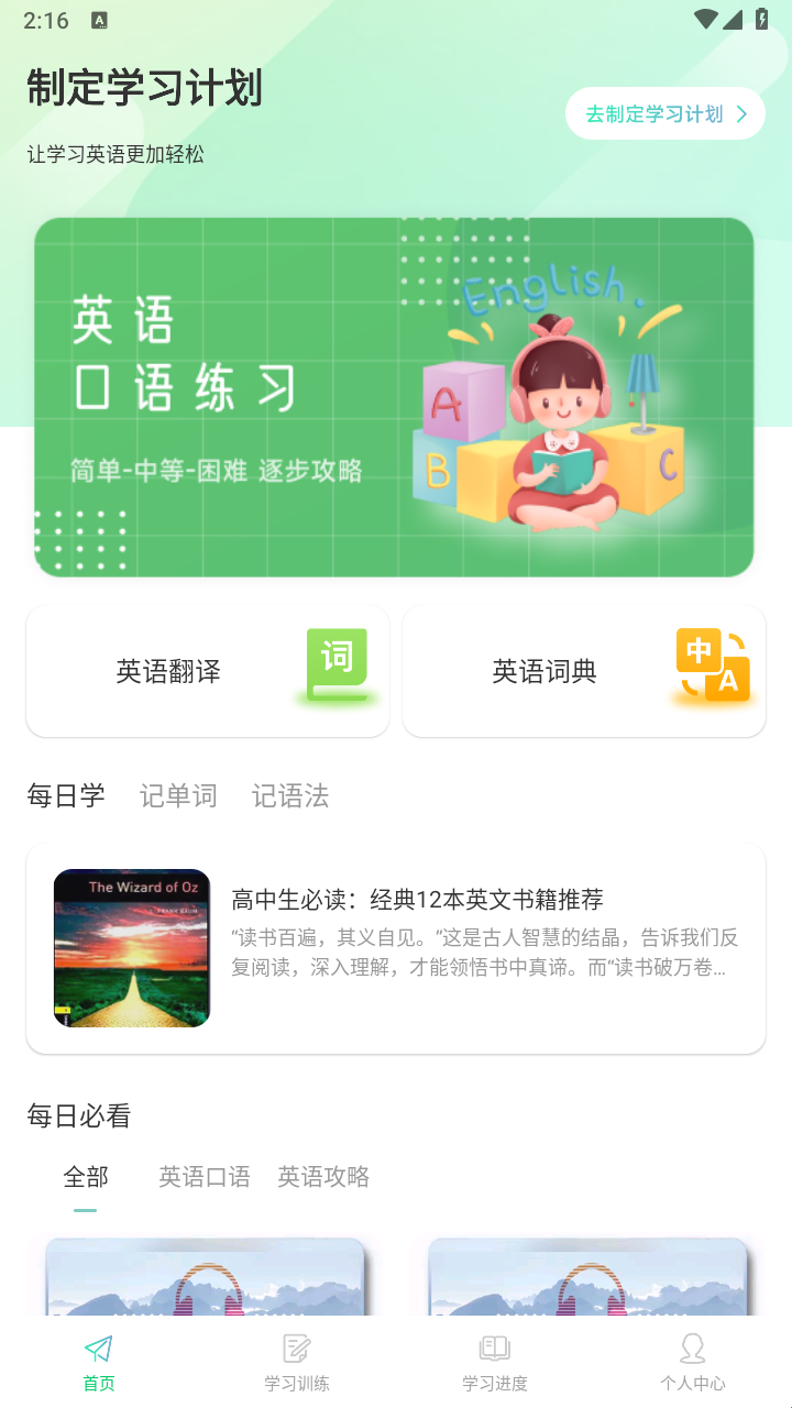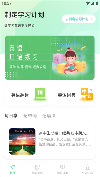 1、打开app就能看到很多的学习功能,有英语词典和翻译功能,能够制定学习计划。