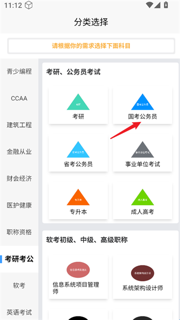 3、首页可以进行查看资料、考试刷题、章节练习等,上栏可切换科目。