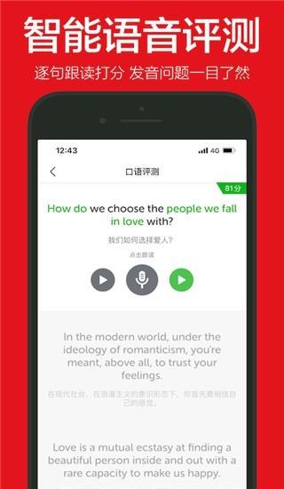 1、智能语音评测:逐句跟读打分,发音问题一目了然。