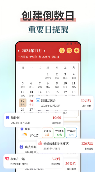 4、日历功能,不仅查看日期、节假日等信息,还与天气模块紧密集成。