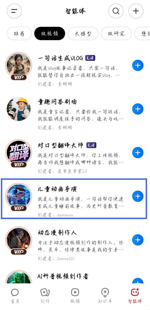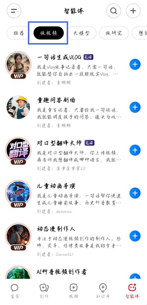 2、选择【做视频】一栏,根据视频类型在里面选择智能体。