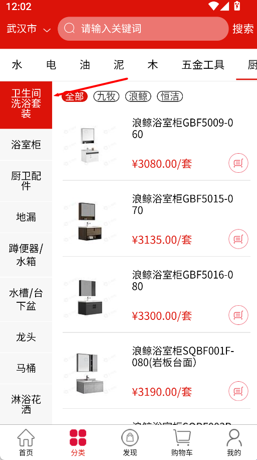 1、登录云辅材App,在首页分类中点击“厨房卫浴”进入对应商品列表。