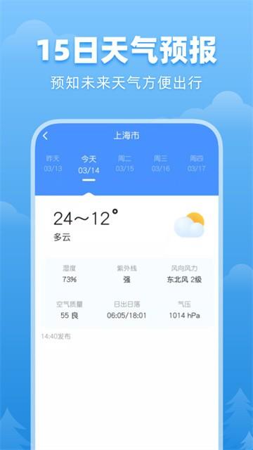顺心天气是一款专业的天气预报软件,让用户可以随时关注到天气变化,毫秒级别的精确气象预测的,让你可以提前做好出行规划,提供未来15天的天气预报,每天的数据都会不断地变化,还有气象灾害警示,用户需要提前做好防患灾害的准备。降雨雷达图走向趋势清晰,还可以查询未来空气质量,为你的健康保驾护航。