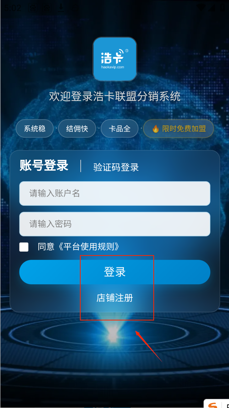 4、要是还没账号可以点店铺注册,注册完就能用账号或验证码登录了,输入信息时仔细点别出错,蓝色按钮很显眼容易找到的。
