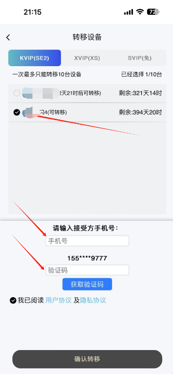 勾选需要转移的设备,输入手机号,获取验证码,阅读协议确认转移即可。
