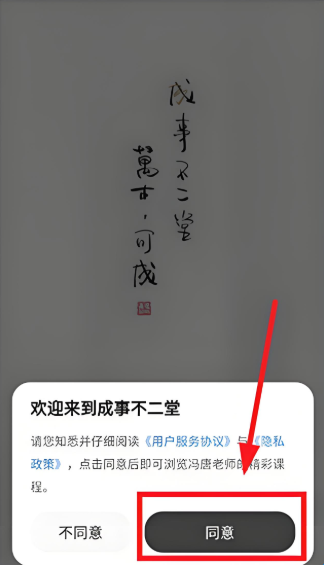 1、下载安装并打开成事不二堂app,在欢迎来到成事不二堂提示界面点击同意。