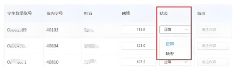 3、在成绩列中输入学生考试成绩(学生状态默认为“正常”),若学生缺考,需在备注中输入缺考原因。请老师们务必在备注中填写学生缺考的实际原因以备案待查。