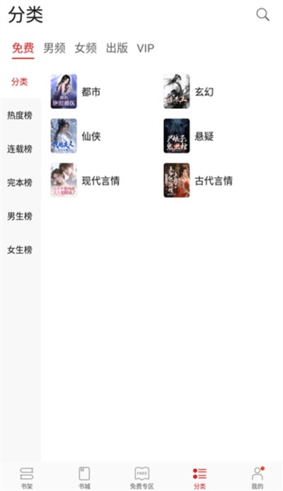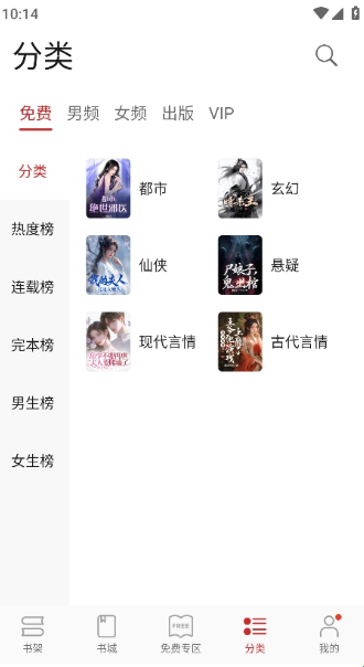 4、清晰的分类频道,带去免费、男频、女频、出版以及vip的频道。