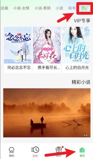 2、在首页导航栏选择“热门”分类,浏览推荐小说,点击封面即可进入详情页开始阅读或收听内容。