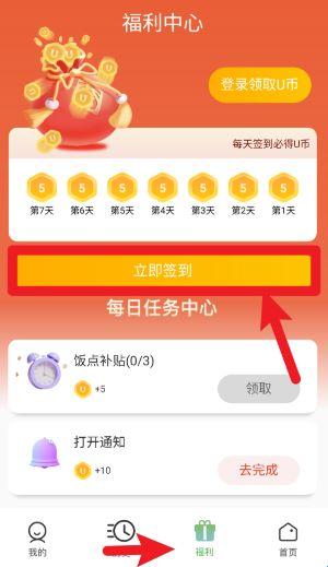 3、点击底部“福利”按钮进入福利中心,每日签到可领取U币,完成任务如开启通知也能获得额外奖励。