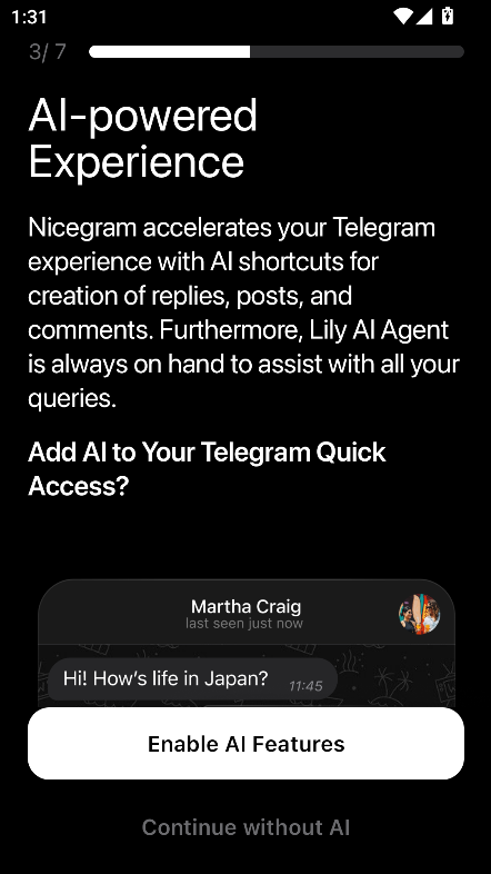 Nicegram是一款基于Telegram源码深度定制的第三方客户端,其丰富的AI驱动功能和用户友好的设计,可以极大地优化用户的沟通体验。应用不仅支持无限数量的账户切换,还提供个人非托管钱包和智能助手,这些创新设计使信息交流更加高效和智能。对于想要提升社交体验的用户来说,Nicegram无疑是一个非常值得尝试的选择,快来下载体验吧。