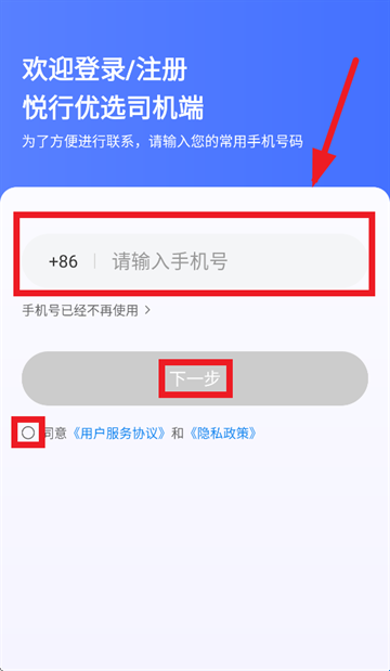 2、进入登录界面后,输入手机号,勾选同意《用户服务协议》和《隐私政策》,点击下一步获取验证码登录即可。