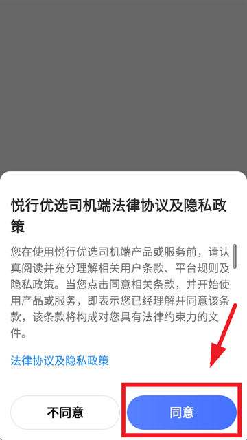 1、打开悦行优选司机端app,先同意悦行优选司机端法律协议及隐私政策。