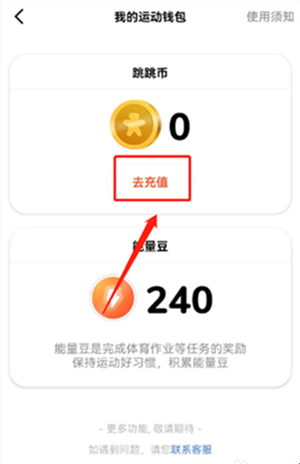 2、进入到我的运动钱包页面点击跳跳币下的去充值选项。