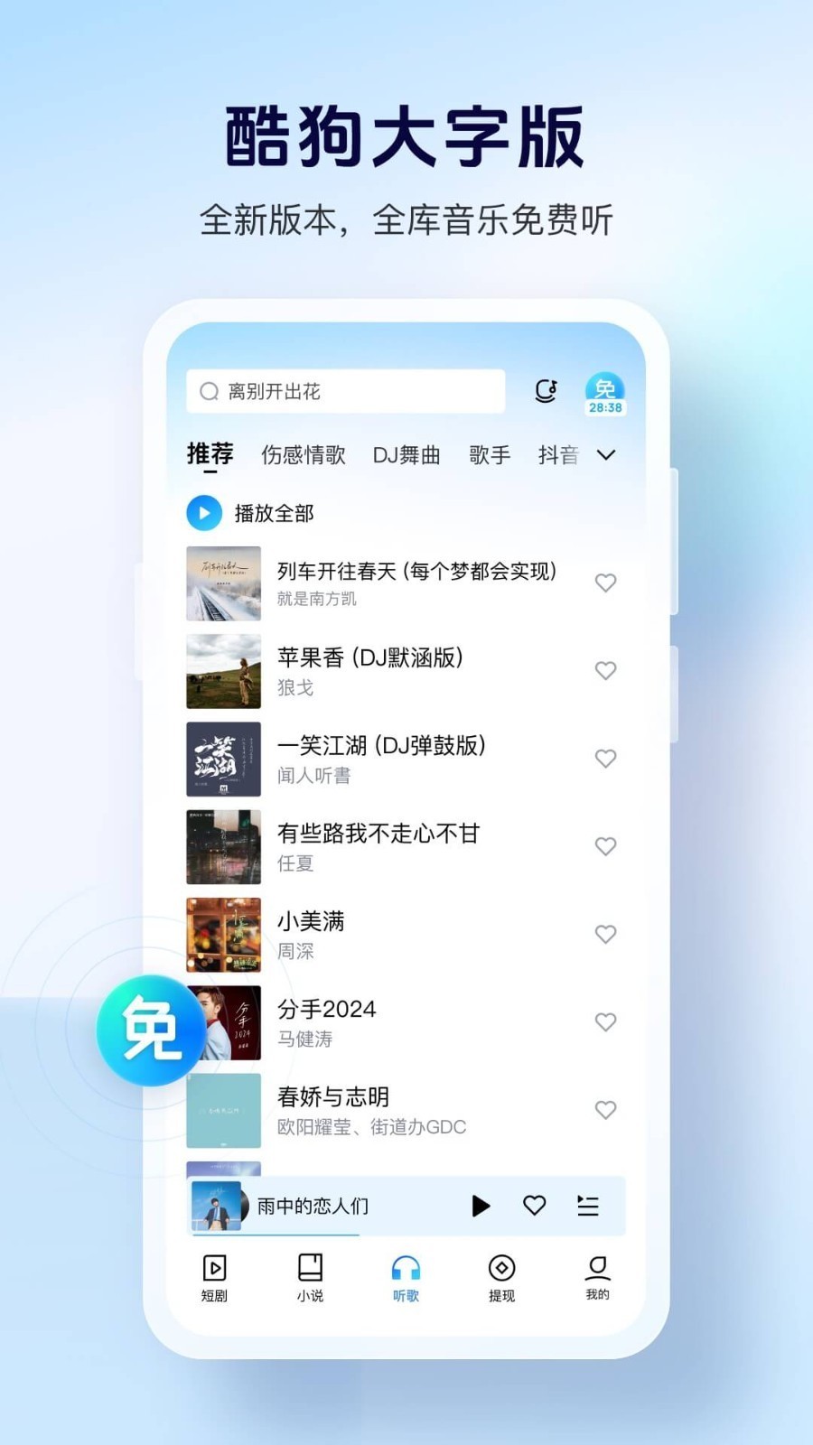 酷狗大字版音乐赚钱非常适合中老年朋友的一个版本,全新大字版本的界面设计更加清晰简约,方便老年人更轻松的看懂其中的内容,在这里有这里超简便的功能,超简单的听歌识曲,简单的语音控制能够随时帮助中老年不识字,以及不会操作的尴尬情况。而且这里的音乐资源全部都是可以免费下载使用的,老年人想要下载的歌曲在这里都可以轻松找到,有需求朋友就来这里下载安装哦。