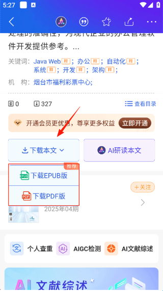 3、打开需要下载的论文,往下滑动,点击下载本文,选择下载格式即可。注意:下载论文到本地需要付费。