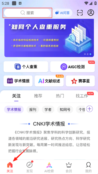 1、打开手机知网APP,点击屏幕上方的搜索栏。