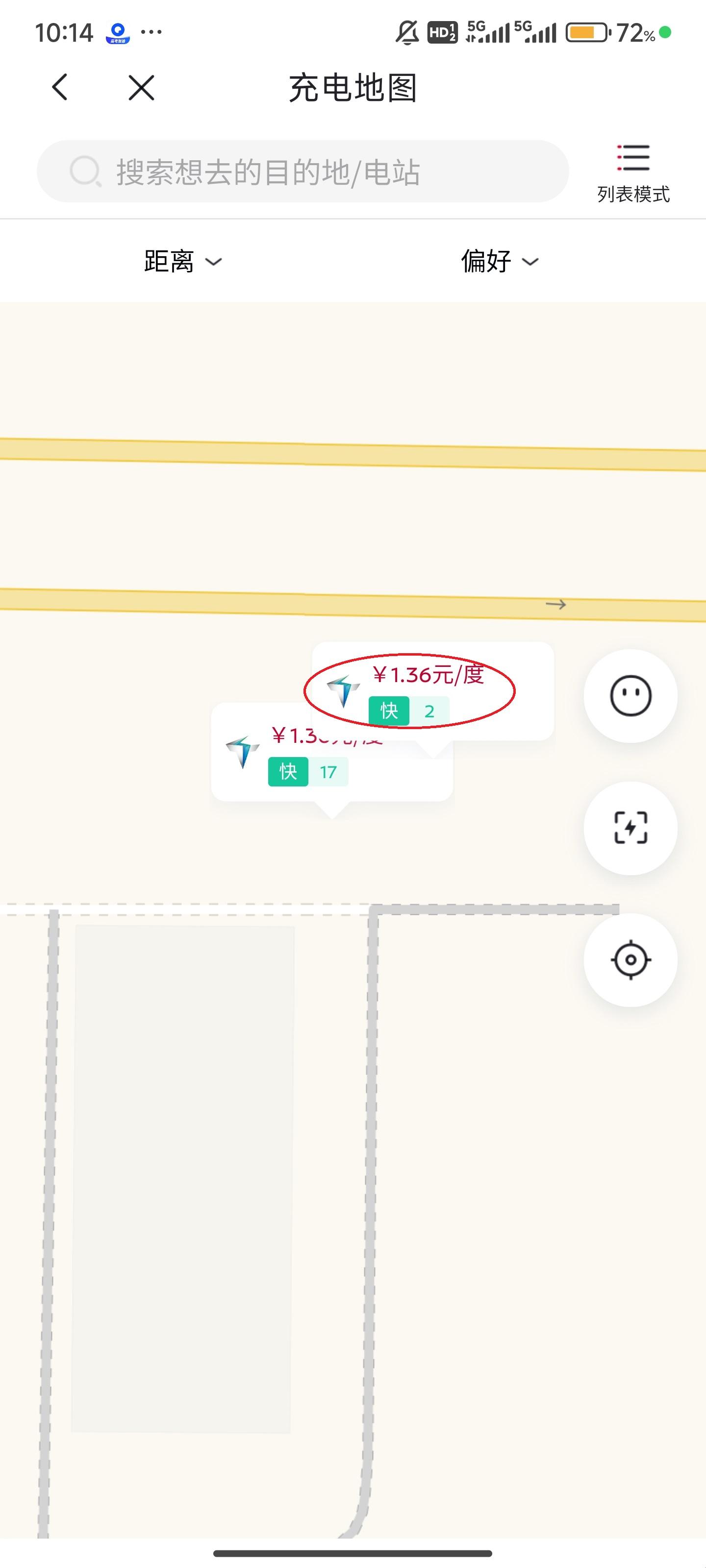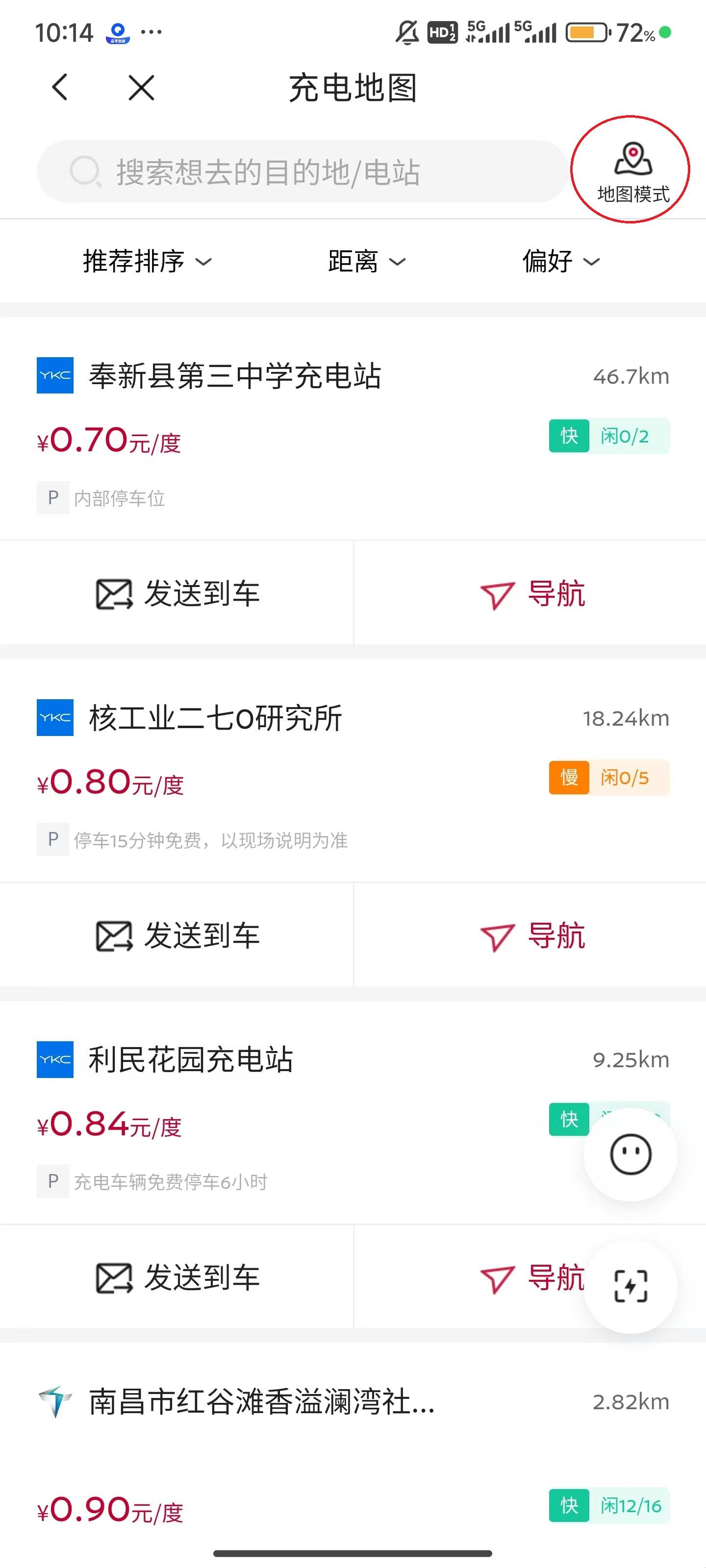 3、可以看到附近的充电站,但不够明确,点击屏幕右上角的“地图模式”。