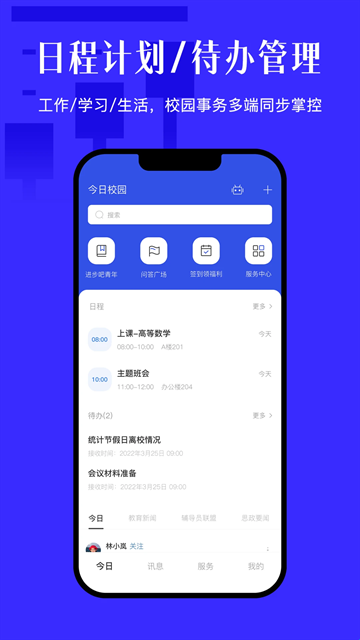 2、校园服务:看课表、查成绩、充值校园卡,校园黄页、考试安排、图书馆信息、后勤报修,学习生活井井有条。