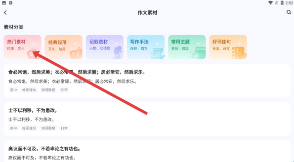 3、在作文素材页面选择热门素材分类,查看其中经典语句与论述内容,为作文写作积累优质素材,助力创作。