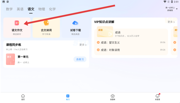1、在语文学习板块点击语文作文图标,进入作文功能界面,可使用AI写作、作文批改等工具,开启作文学习流程。