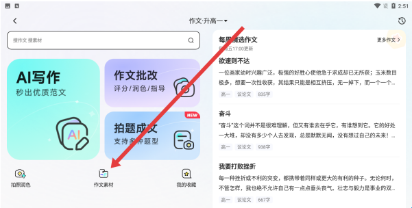 2、进入作文界面后点击作文素材选项,跳转至素材页面,浏览每周精选作文及分类素材,获取写作灵感。