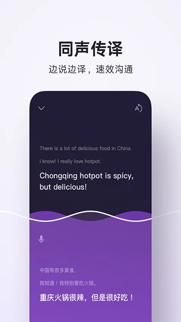 4、同声传译:即说即译、声画同步,解决语音翻译需求。
