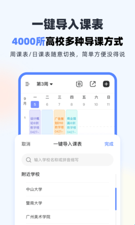 2、快速获取课表:对接超过1500所大学的教务系统,1s导入课表。