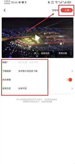 3、接着在上传作品页面中,将作品标题、下载权限、弹幕允许、发布方式选择完成后,点击上传即可。