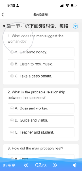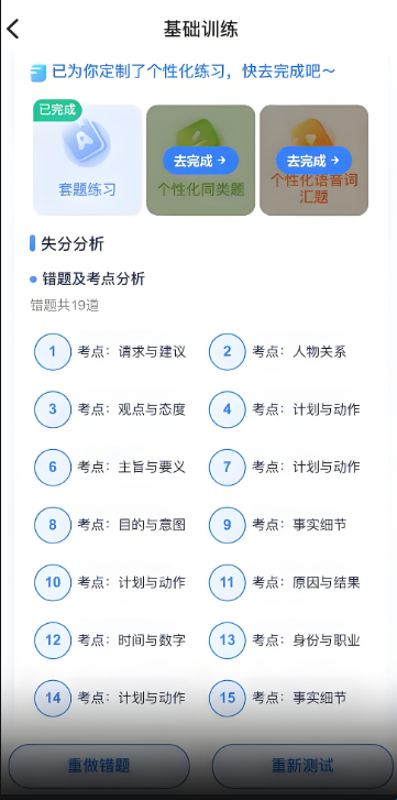 3、呈现从考点、语音、词汇维度的问题。并推送各个维度的个性化训练,哪里掌握薄弱就训练哪里。