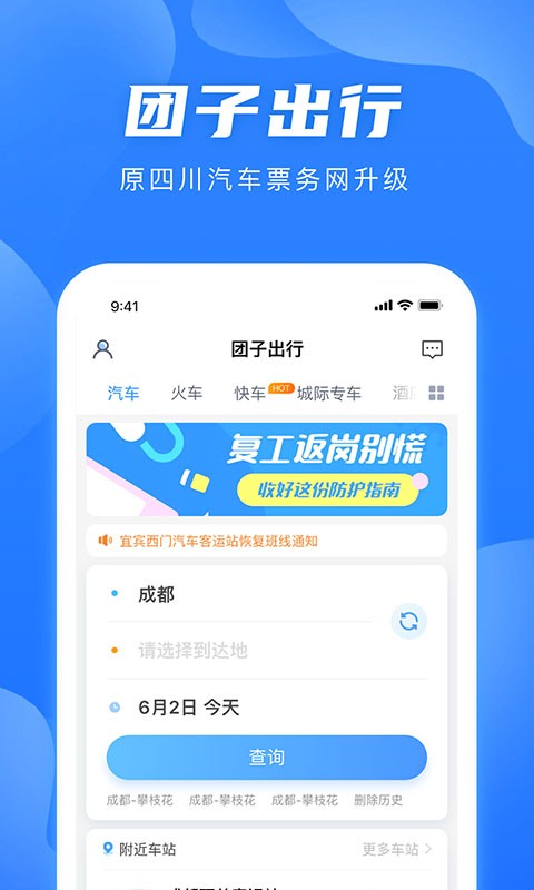 团子出行汽车票查询网上预订app是一款基于用户地理位置的出行app,简称为团子出行app,原名又叫做四川汽车票务网app,可以为交通出行用户提供汽车票预订、火车票预订、城际快车、城际包车、景区门票、景区直通车、接送站服务,软件通过规范化运营,降低各级客运站信息化运营和维护成本,快速提升客运站信息化服务水平,始终坚持定制化出行理念让用户享受专属快捷服务,实现了用户买票不出门,买票不排队的愿景。